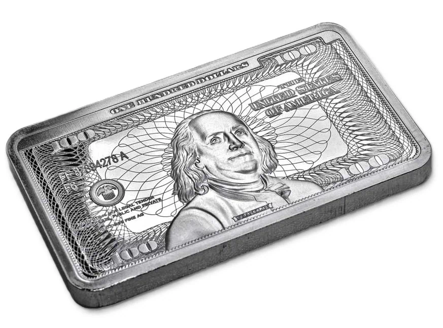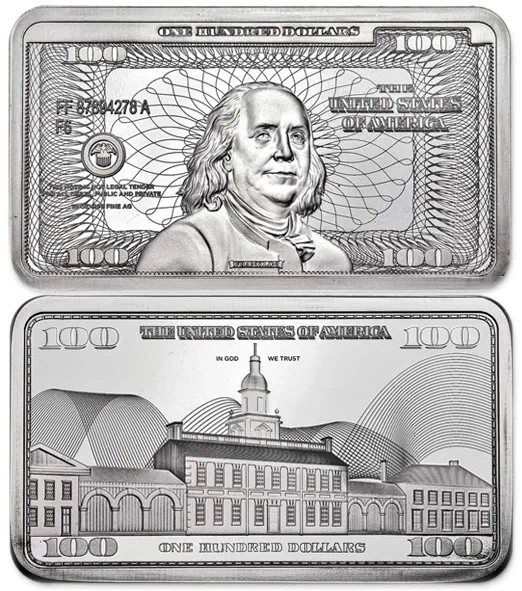 מטיל כסף בעיצוב שטר של 100 דולר בנג'מין פרנקלין, 10 אונקיות ארה"ב