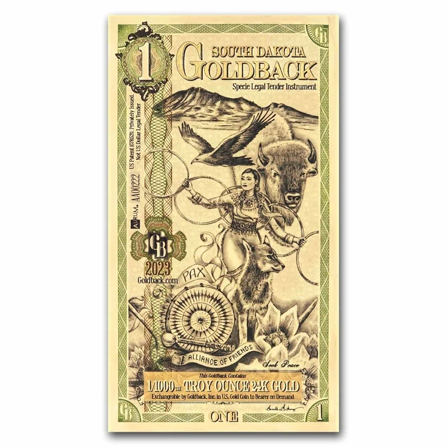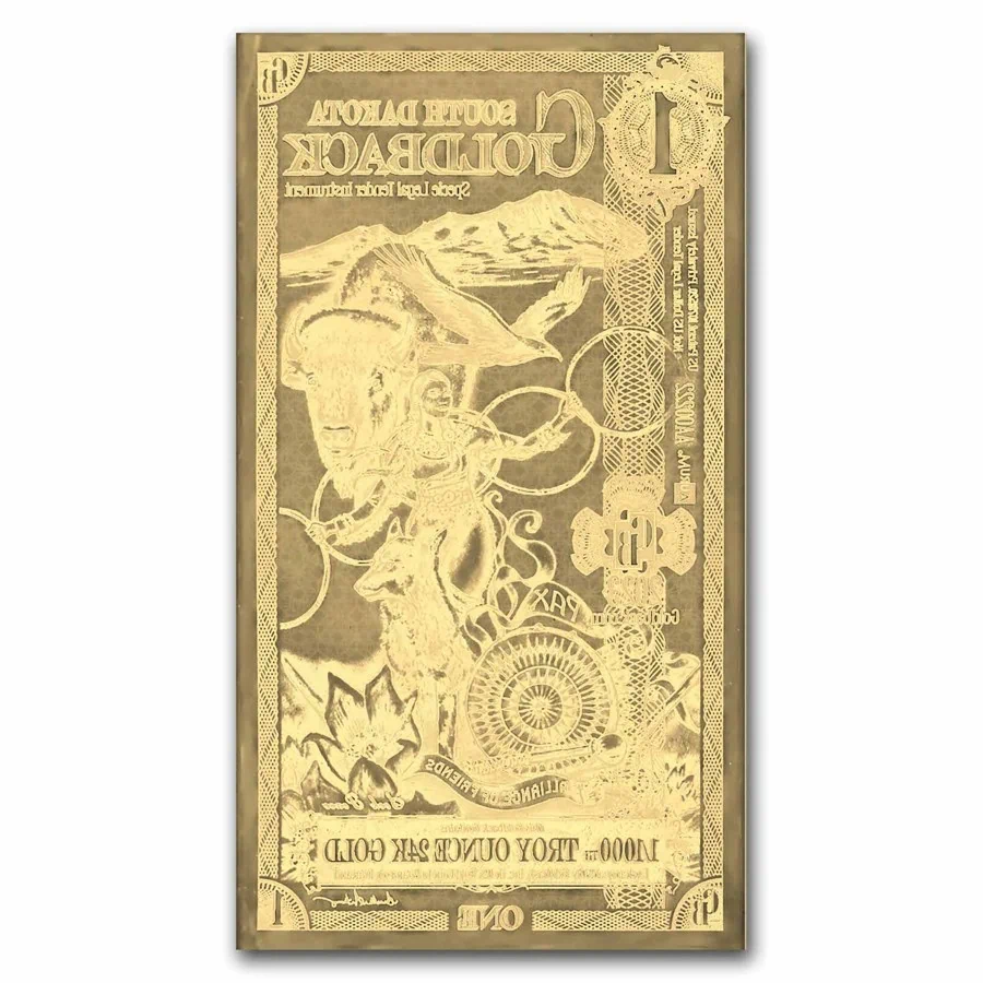 שטרות נייר כסף אלו של דקוטה הדרומית מכילים זהב משובח בטוהר 999 במשקל 1/1000 אונקיות.